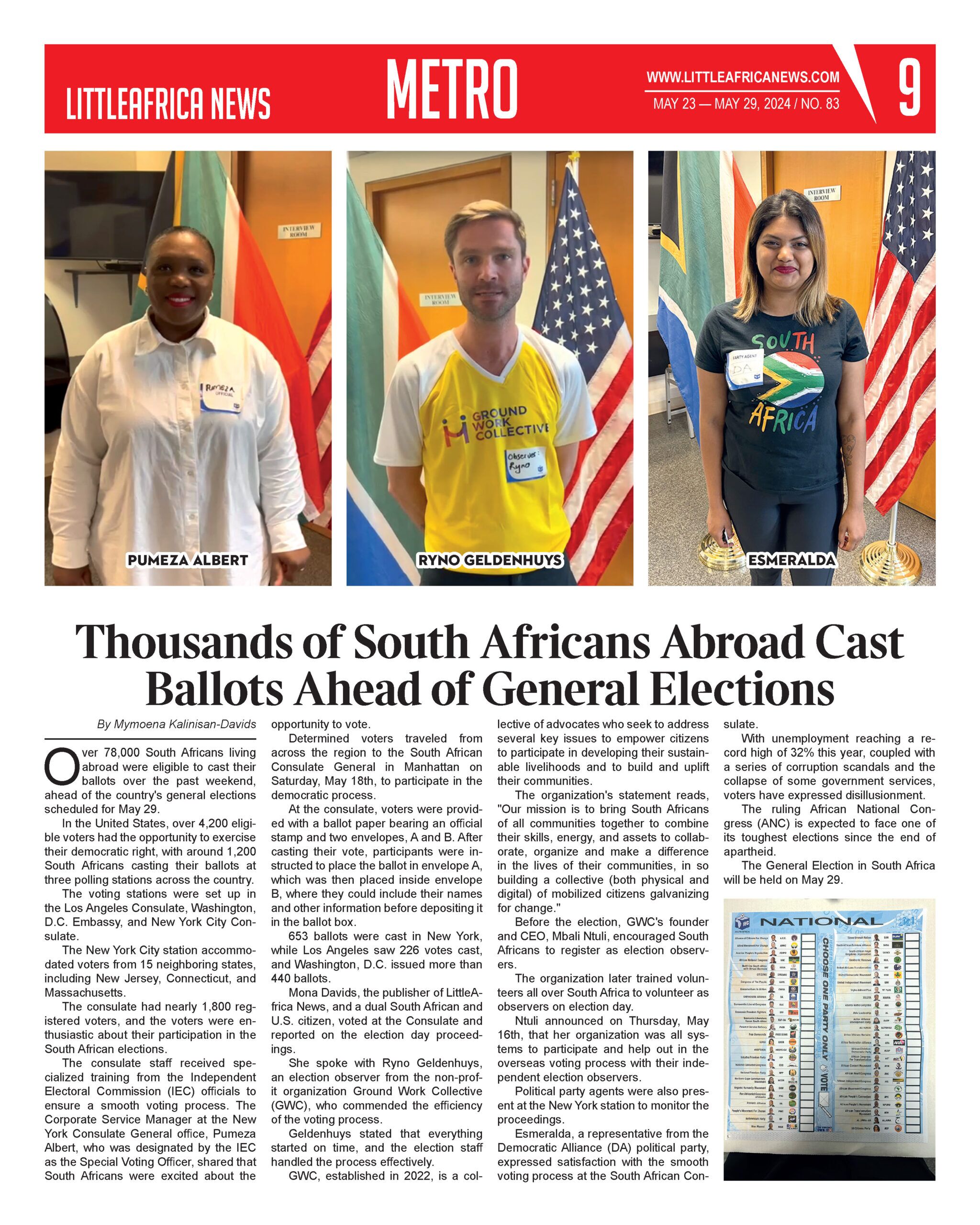 Mona Davids, the publisher of LittleAfrica News, and a dual South African and U.S. citizen, voted at the Consulate and reported on the election day proceedings.