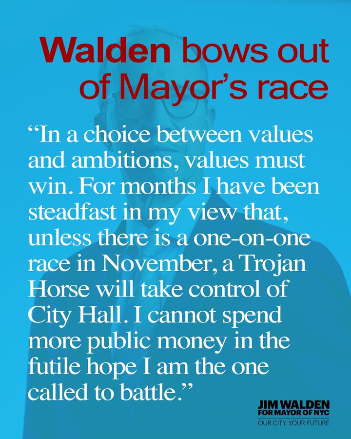 In his post announcing his campaign suspension, Walden said, “For those still trailing in the polls by month’s end, I implore each to consider how history will judge them if they allow vanity or stubborn ambition to usher in Mr. Mamdani.”